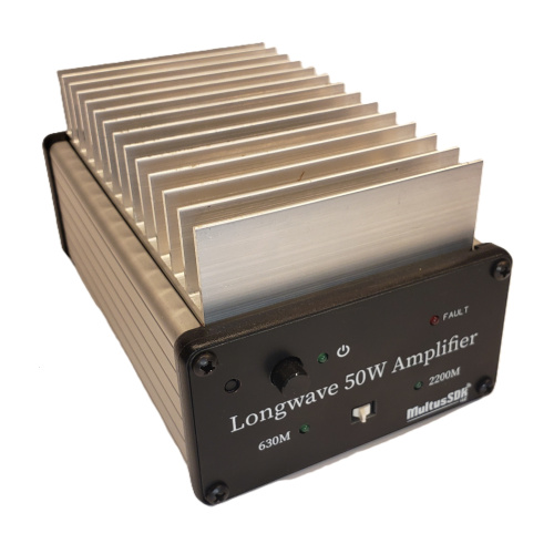 The Longwave 50 is a 50W LF/MF amplifier that runs off a 13.8VDC power supply. It uses a pair of IRFZ24N finals in a push pull configuration and draws about 10A. Covers 2200M and 630M. Requires 1W input.